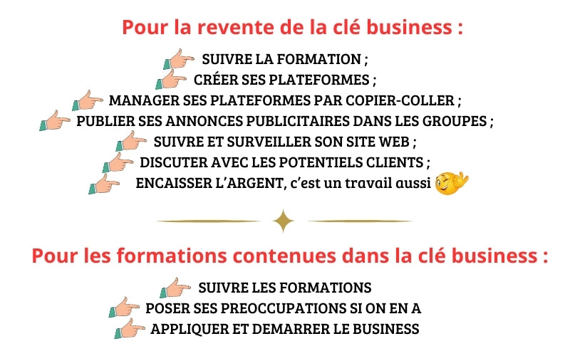 Nous l’avons dit précédemment, nous avons deux volets : La Revente de la CLÉ BUSINESS et l’Utilisation des formations en web entrepreneuriat contenues dans la clé, pour multiplier ses sources de revenus.
