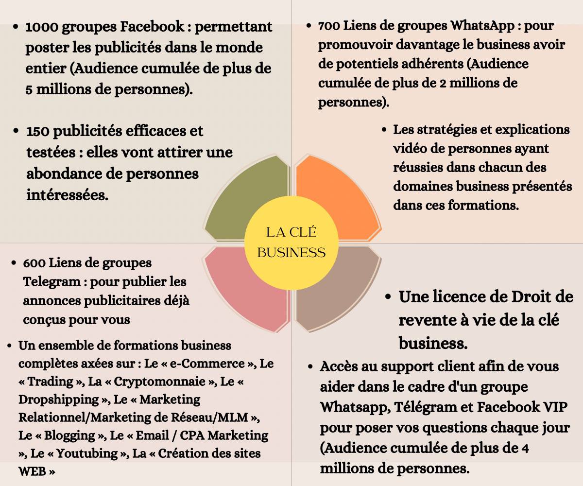 Ouvert à tous, il permet d’investir peu et gagner grand, en ayant une stratégie d’investissement des gains provenant de la revente de la clé business, dans les opportunités de web entrepreneuriat dont les formations complètes sont à portée de main.