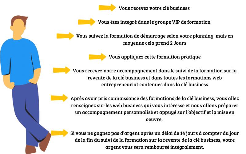 Nous l’avons dit précédemment, nous avons deux volets : La Revente de la CLÉ BUSINESS et l’Utilisation des formations en web entrepreneuriat contenues dans la clé, pour multiplier ses sources de revenus.